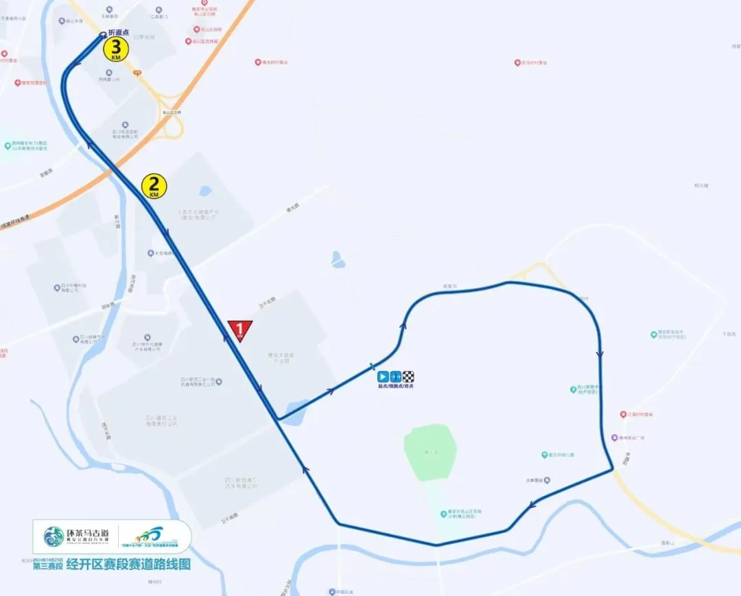 本场比赛赛程80公里,比赛起点从城市广场—名兴草大道南段(城市广场路口)—职教路(瓦窑路口)—永兴大道(德坤广场至瓦窑路口)—学道街—园区大道(蒙山府)—园区大道(雅双园路口)—麓源路(单圈10KM),共绕行8圈。